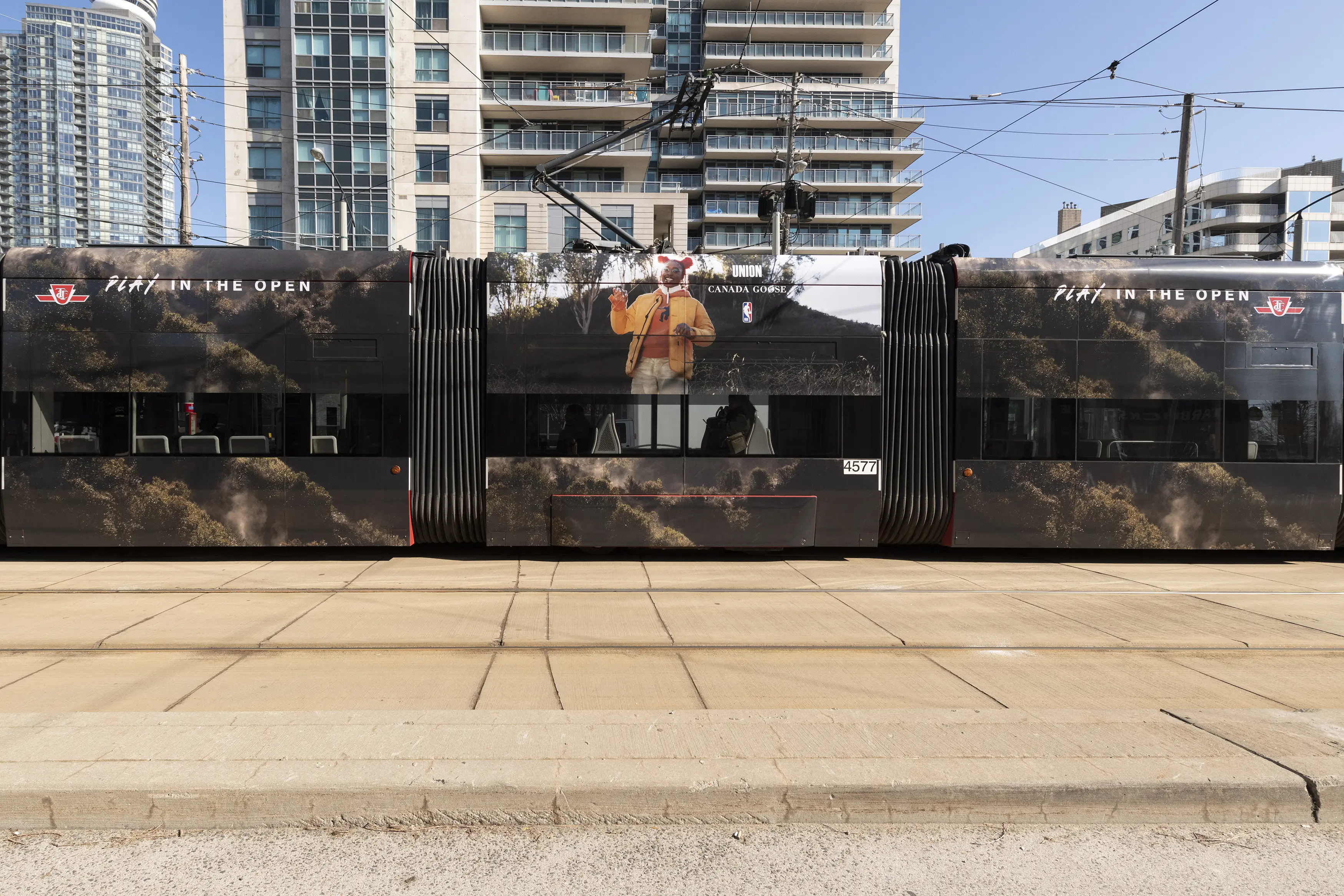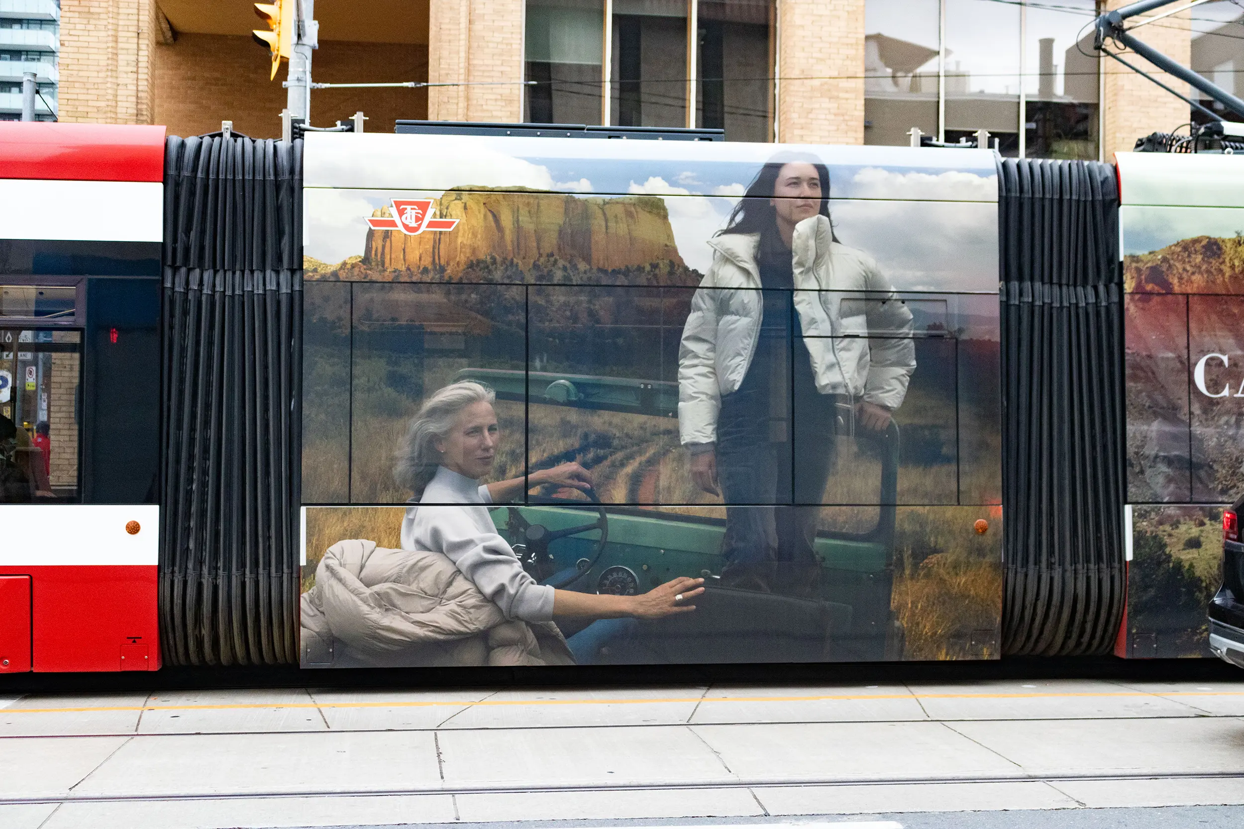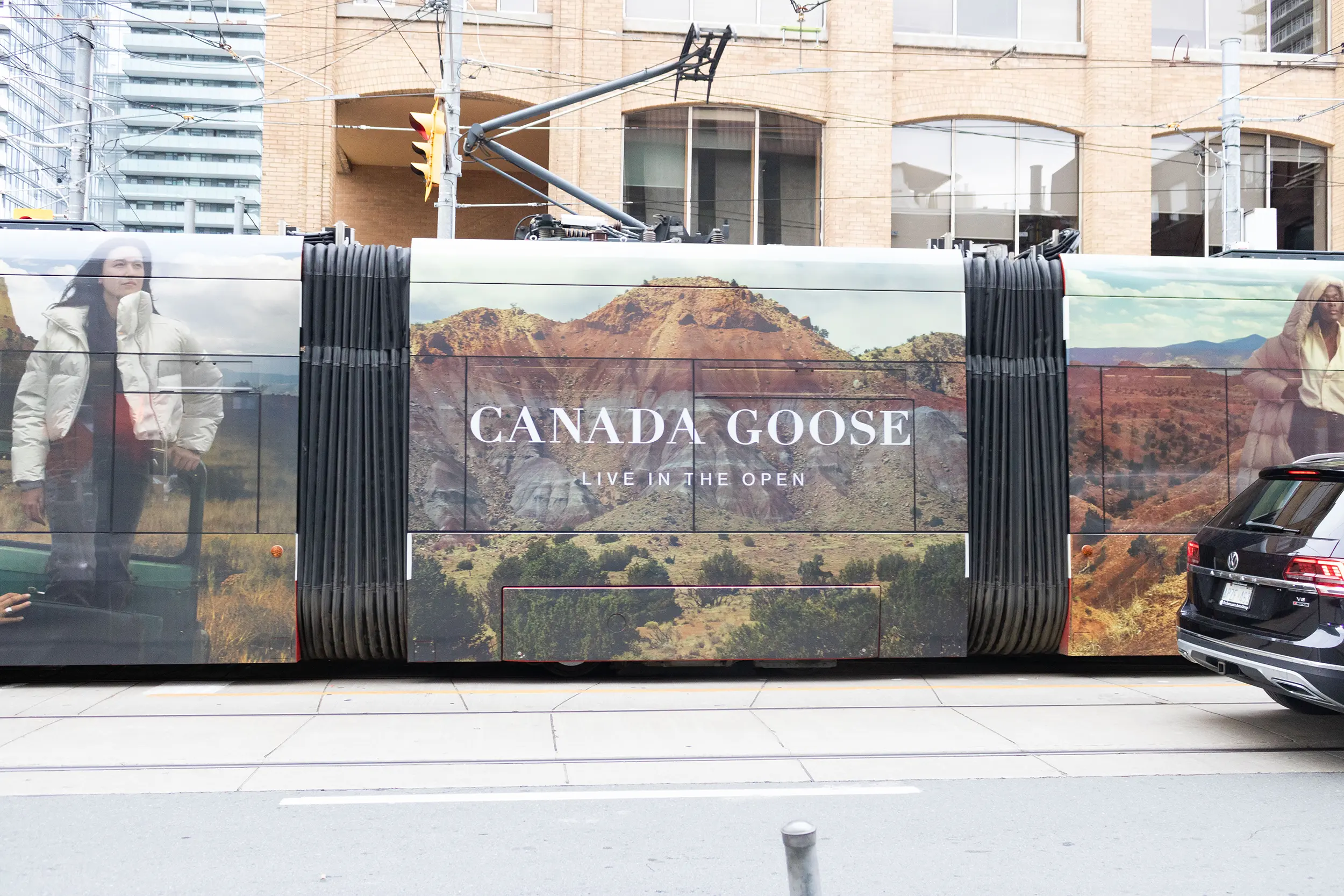 One of Transit advertising’s statement pieces, the Streetcar wrap. Cutting a swath through downtown Toronto with this gorgeous vinyl – Canada Goose partnered with the NBA to develop a stunning campaign that featured breathtaking nature photography.