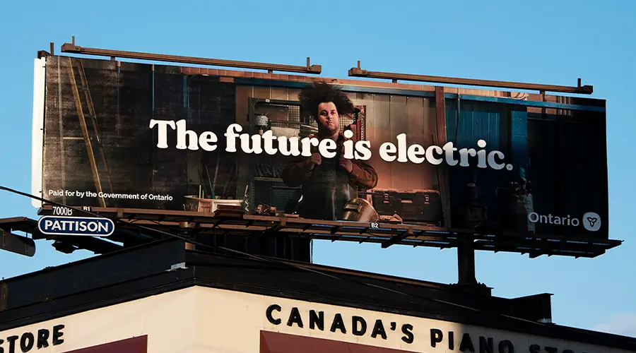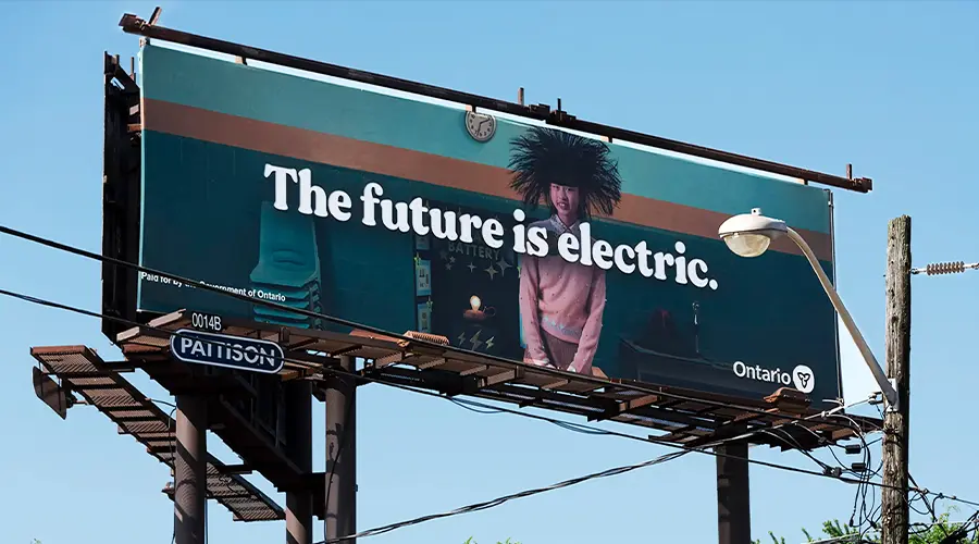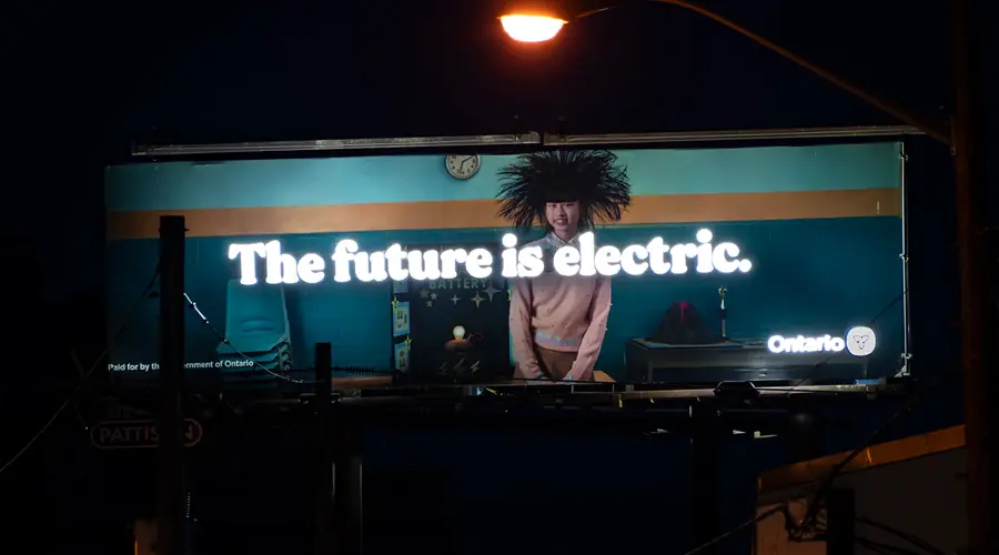 As the demand for clean energy increases, the Ontario Government created this hair-raising campaign to highlight their plan of increasing production of electric vehicles and batteries. To throw light on the subject this Superboard included LED lit lettering to show commuters this brilliant proposal to keep their province green.