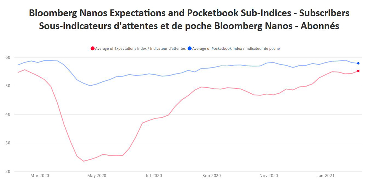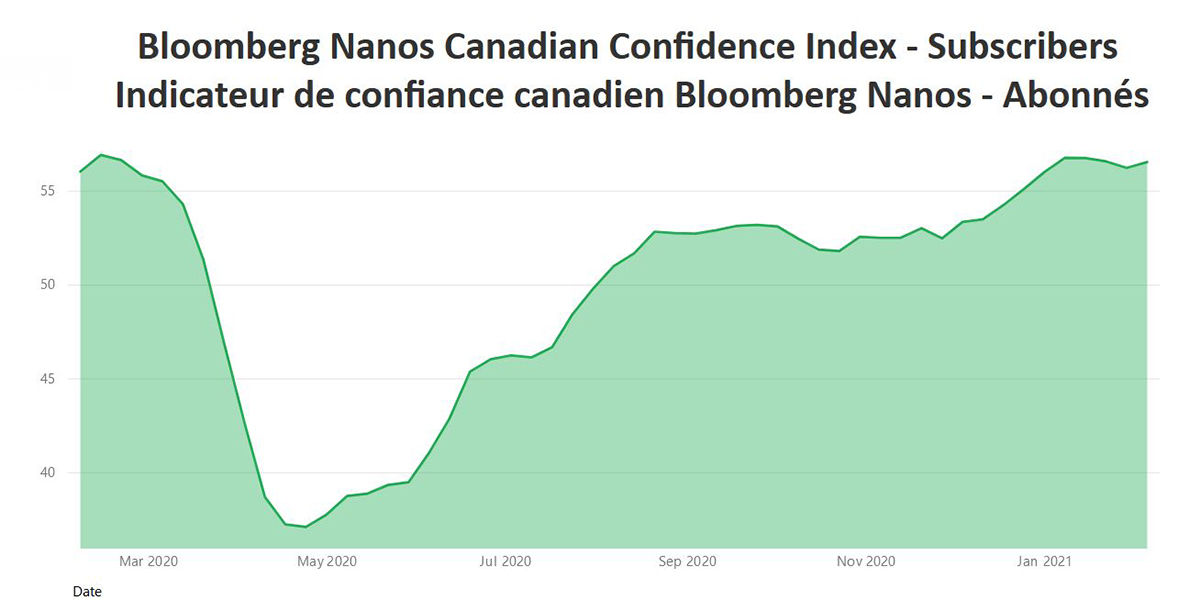 Une enquête importante qui mesure la confiance des consommateurs de façon hebdomadaire depuis 2008, le Bloomberg Nanos Research Canadian Confidence Tracker, révélait qu’à la fin de janvier dernier, l’optimisme quant à l’économie correspondait à celui de la même période prépandémie de 2020, à 56 %.