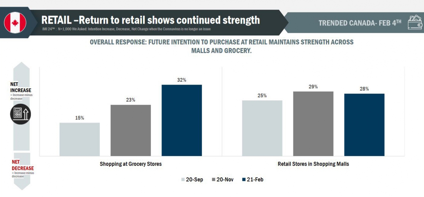 Comme nous l’avons déjà mentionné, certaines marques et certaines entreprises attendent de voir si cet optimisme se concrétisera en dépenses. Elles ne doivent pas attendre! Il existe une autre période au cours de la dernière année pendant laquelle la confiance des Canadiens s’est accrue et les demandes refoulées pour magasiner et vivre à l’extérieur ont été satisfaites : à la fin de l’automne 2020. Lorsque l’homologation des vaccins faisait la manchette, la confiance et l’optimisme se sont mis à croître ensemble, à un point tel que la RBC rapportait que les Canadiens dépensaient plus pour les fêtes 2020 qu’ils ne l’avaient fait au cours des dix dernières années. Quoi de mieux que de combler des demandes inassouvies!