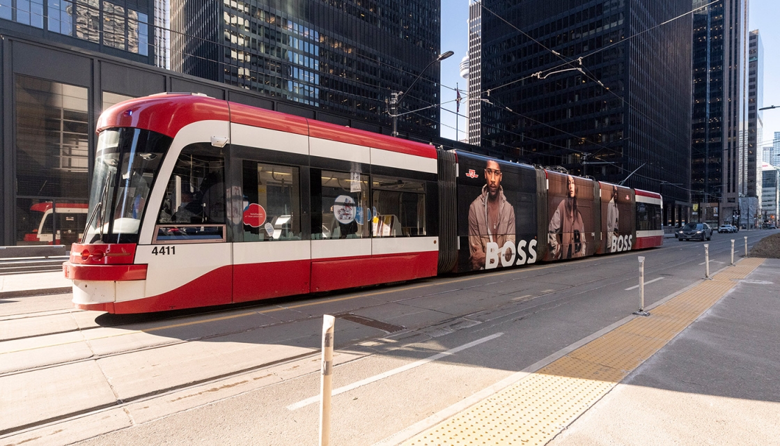 Consider an average commuter’s daily journey within a large urban area like Toronto. As they move around the city, they are likely to encounter many forms of transportation—including streetcars, subways, and LRT trains. This presents the perfect opportunity to capture the attention of key audiences. How? By using visually stunning full vehicle wraps and murals. Look no further than the Hugo Boss campaign (pictured below) as evidence of a high-end, modern canvas with the ability to cut through the downtown core of Canada’s most populous city.