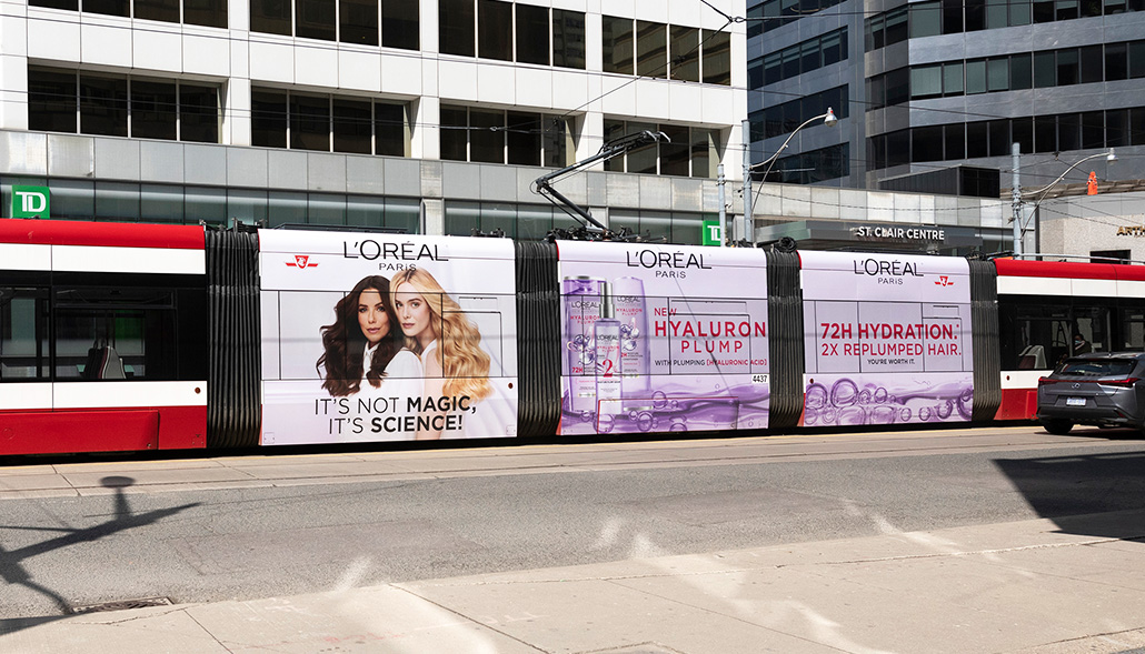 But as digital fatigue weaves itself increasingly into pandemic fatigue, many brands have begun to invest in areas outside of online advertising. Out-Of-Home formats have seen an especially pronounced resurgence in the last year—particularly those delivering contactless, seamless experiences that create lasting impressions. A prime example of this is transit advertising. With big-name brands like L’Oreal, Hugo Boss and Chanel investing in this format for the first time in recent history, more and more businesses are turning to large format transit vinyl as their new canvas for captivating, magazine-like ads.